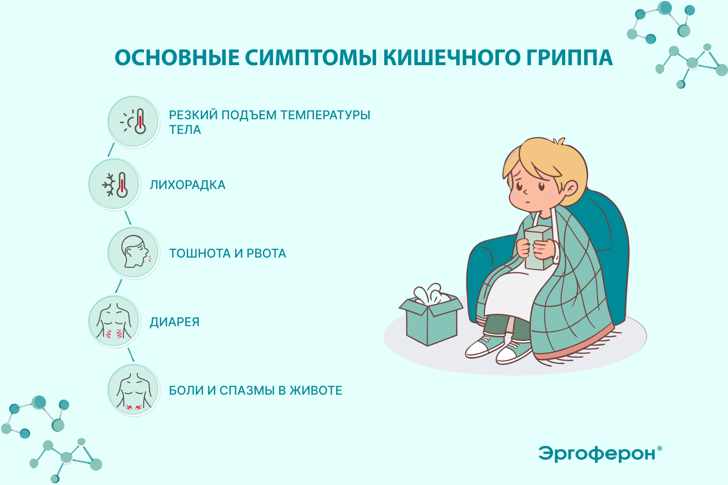 Кишечный грипп — народное название ротавирусной инфекции (РВИ). Она представляет собой острое вирусное заболевание, поражающее желудочно-кишечный тракт (ЖКТ). Эта болезнь проявляется такими симптомами, как рвота, диарея, боли в животе и повышение температуры тела. Несмотря на название, РВИ не имеет ничего общего с такой острой респираторной вирусной инфекцией, как грипп1.